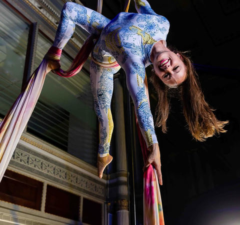 In the circus realm, Jessica specializes in aerial hoop, silks, sling, aerial bartending, and stilt walking.